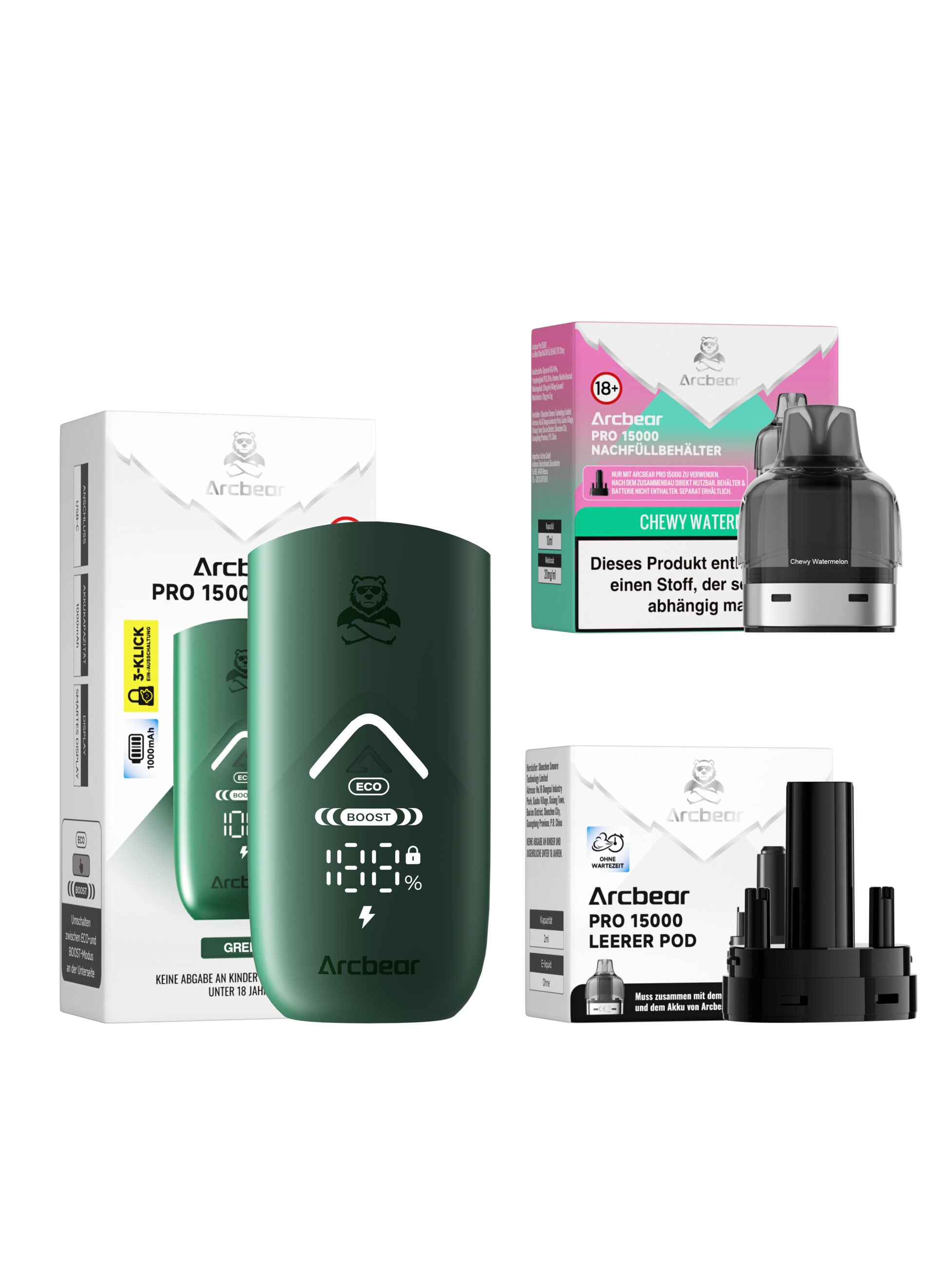 Komplettes Starter Kit: Arcbear Pro 15000 Gerät + vorgefülltes 10 ml Pod, ECO/BOOST-Modus, 3-Klick Ein-/Ausschaltung.